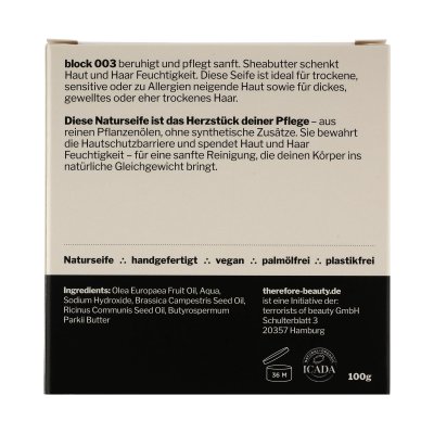 Block 003 duftet verwöhnend nach Sheabutter und enthält bewusst nur ganz wenig: Olivenöl, Rapsöl, Rizinusöl und Sheabutter.