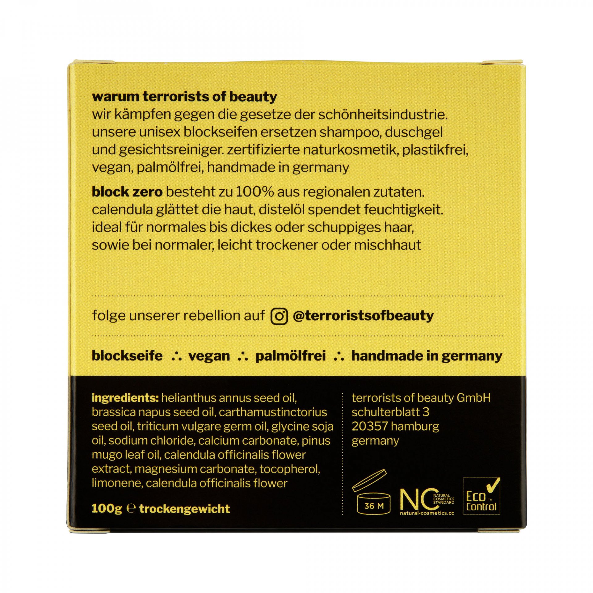 Für Haar, Gesicht und Körper. Block zero besteht ausschließlich aus Zutaten, die regional in Deutschland angebaut und verarbeitet wurden. Block Zero ist ein bewusstes back to zero, ein zurückbesinnen auf die heimische Natur und eine Befreiung von sinnloser Globalisierung und klimabelastenden, internationalen Lieferketten.