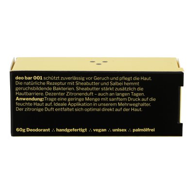 Deo Bar 001 protect + refresh ist ein Naturkosmetik-Deodorant, das wir auf Basis von Sheabutter und Salbei entwickelt haben. Die Entstehung von Geruch wird auf natürliche Weise gehemmt. Salbei hat antibakterielle und antifungale Eigenschaften und wirkt so ganz natürlich gegen die eigentlichen Verursacher von Schweißgeruch. Sheabutter pflegt die Haut. Das Deo duftet dezent-frisch nach Zitrone