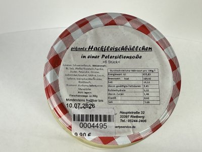 Die leckersten Hackbällchen der Welt, aus Schweinefleisch in Petersiliensoße, nachhaltige Glasverpackung.