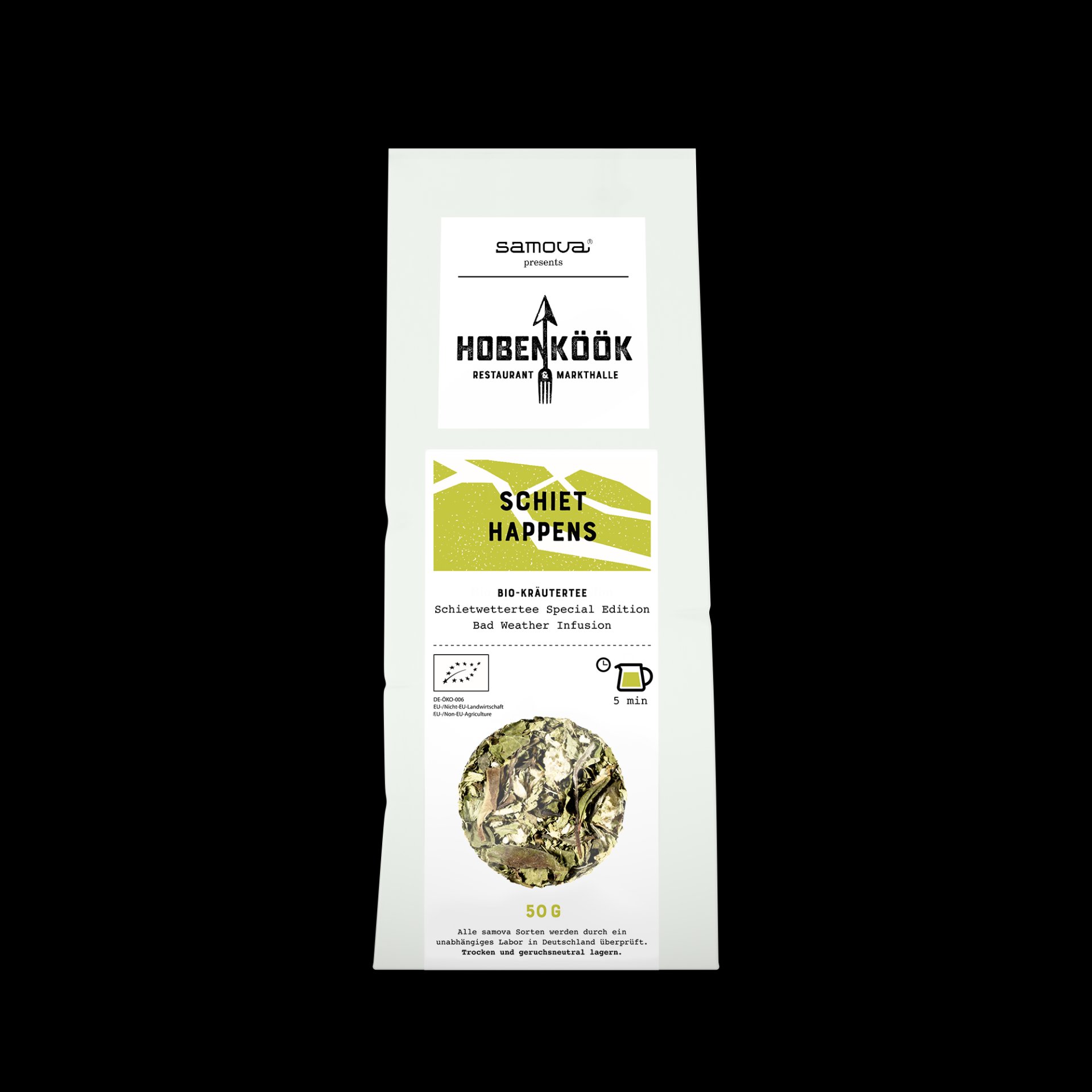 samova Gründerin Esin und Kult-Koch Thomas Sampl von der Hamburger Hobenköök hatten schon lange die Idee, dieses traditionelle »Gute-Laune-Gebräu« einmal unter die Lupe zu nehmen. Das Ergebnis ist Schiet Happens: eine aromatische Bio-Kräuterkomposition aus 17 heimischen Wunderpflanzen, die sprichwörtlich graue Wolken vertreiben können. Und dabei ganz ohne zugesetzte Aromen auskommt!