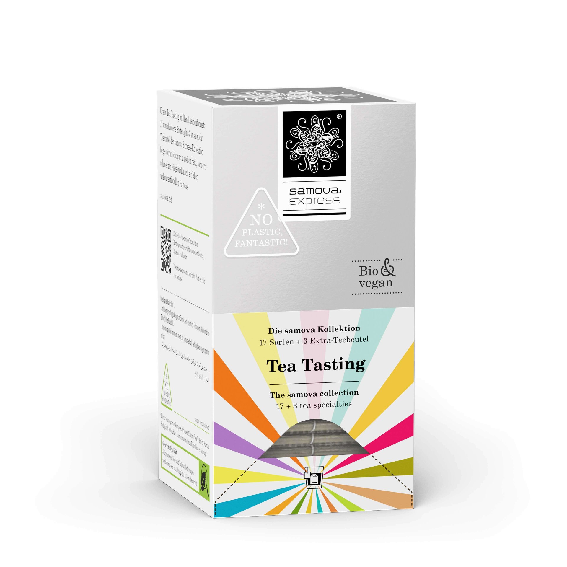 Unser Tea Tasting im Handtaschenformat: 17+3 verschiedene Bio-Sorten der samova Express-Kollektion begeistern nicht nur klassisch heiß, sondern schmecken eisgekühlt auch auf allen unkonventionellen Parteas.