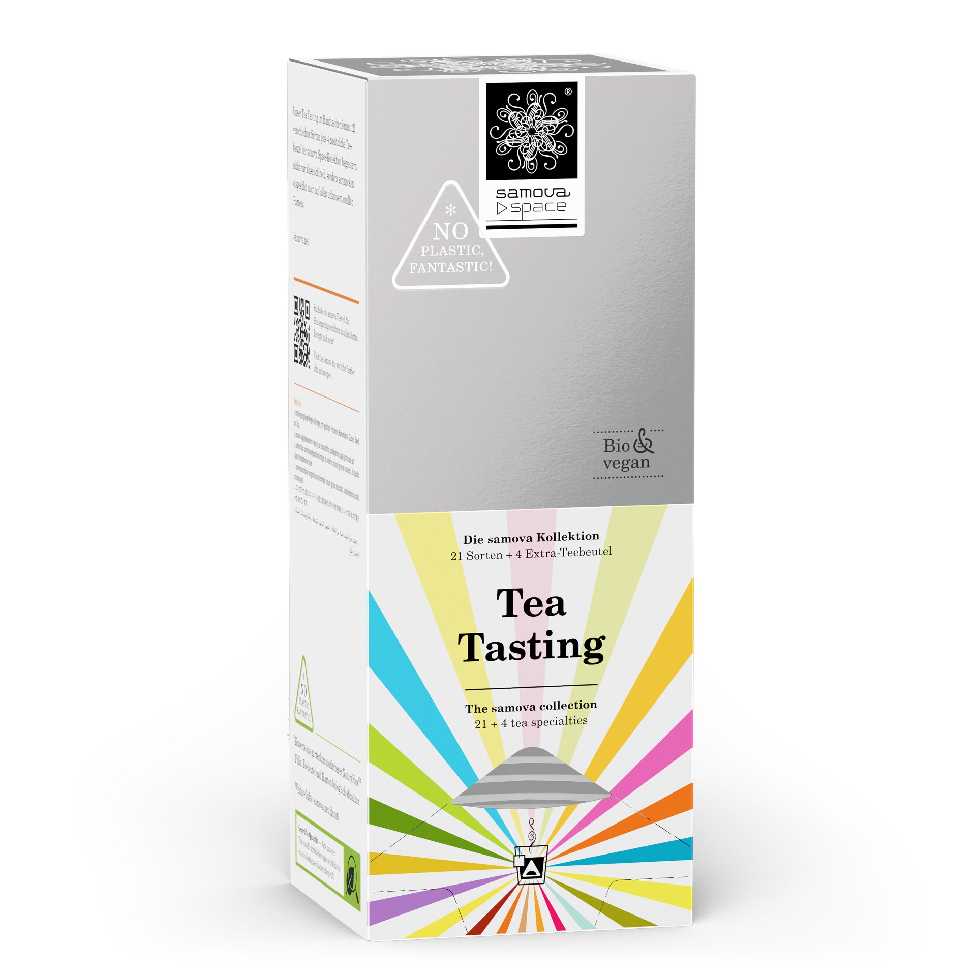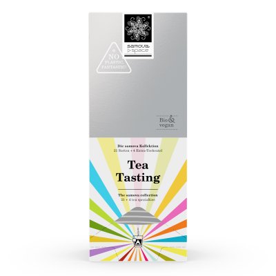 Unser Tea Tasting im Handtaschenformat: 20 verschiedene Sorten plus 5 zusätzliche Teebeutel der samova Space-Kollektion begeistern nicht nur klassisch heiß, sondern schmecken eisgekühlt auch auf allen unkonventionellen Parteas.