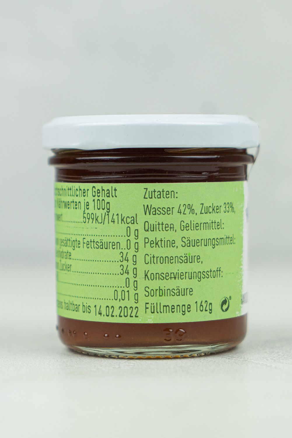 Wasser 42%, Zucker 33%, Quitten, Geliermittel: Pektine, Säuerungsmittel: Citronensäure, Konservierungsstoff: Sorbinsäure