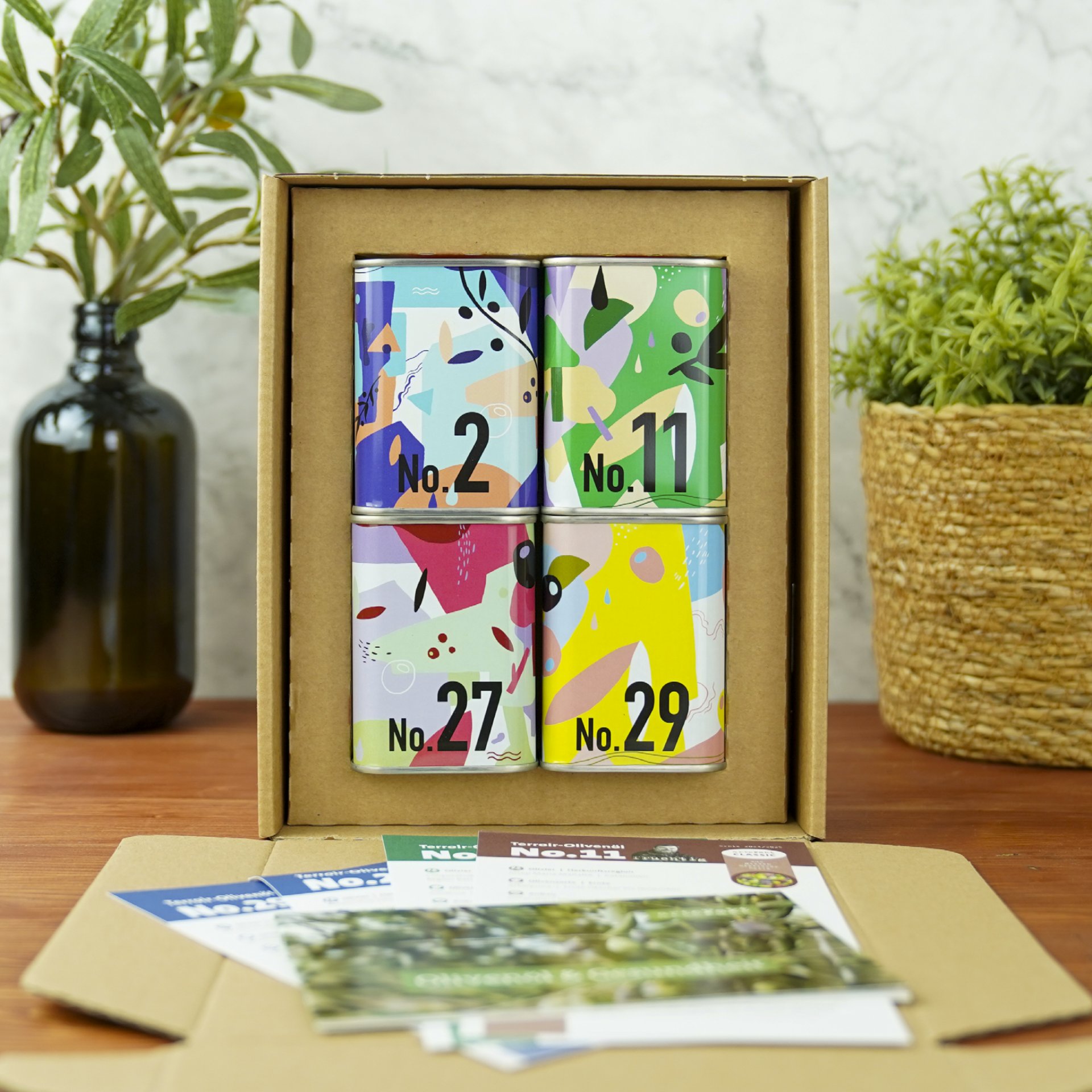Das Probier- und Geschenkset enthält 4 Olivenöle. Dazu die Olivenpässe als Karten in Schmuckversion.
