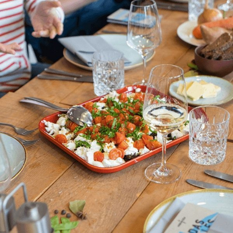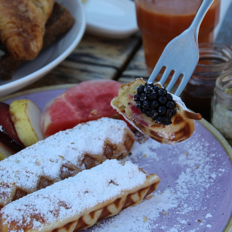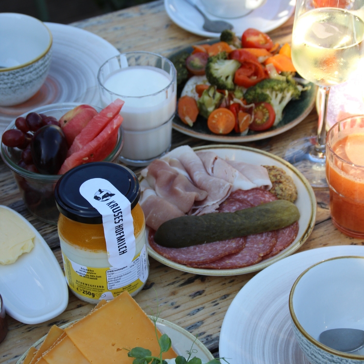 Sauerteigbrote von Lenes Bio Backstube, Hobenköök Schwarzbrot mit Äpfeln und Buttermilch, Franzbrötchen und Croissants von Bäckerei Moin, Krusties und Körnerbrötchen, Butter von Meierei Horst, Margarine, Marmeladen von Frau Frucht und Herrn Gemüse, süße und herzhafte Aufschnitte und Aufstriche sowie vegane Optionen, Overnight Oats, Hobenköök Granola mit Nüssen und Saaten, Obst aus dem alten Land, Rührei mit Schnittlauch und Petersilie von Andresen, Norddeutscher Käse mit Himbeer-Senf und Eingepickeltem aus der Hobenköök, eingelegtes Gemüse mit veganem Vanozza Käse und Oliven, Wildkräuterpesto, Räucherlachs und Rauchmakrelen mit frischem Meerrettich und Gurke