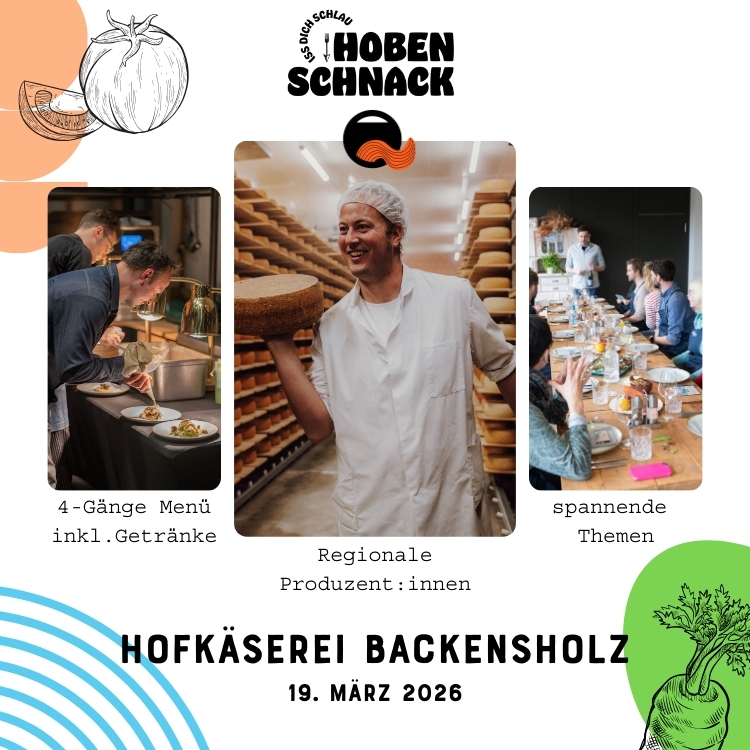 Käse, Kulinarik, Kreisläufe und ökologische Landwirtschaft… damit kurz die Welt retten?! Der Backensholzer Hof steht für erstklassige, handwerklich hergestellte Käsespezialitäten. Von mild bis kräftig, von cremig bis würzig – die Käse entstehen mit viel Können, bester Milch und echter Hingabe. Nachhaltigkeit ist dabei keine Option, sondern Grundsatz: Von der Weide bis zum Reifekeller werden Kreisläufe neu gedacht. Wie das alles funktioniert und wer ganz viel über die herzhafte Fooddroge Käse wissen will, ist bei diesem Hobenschnack richtig!