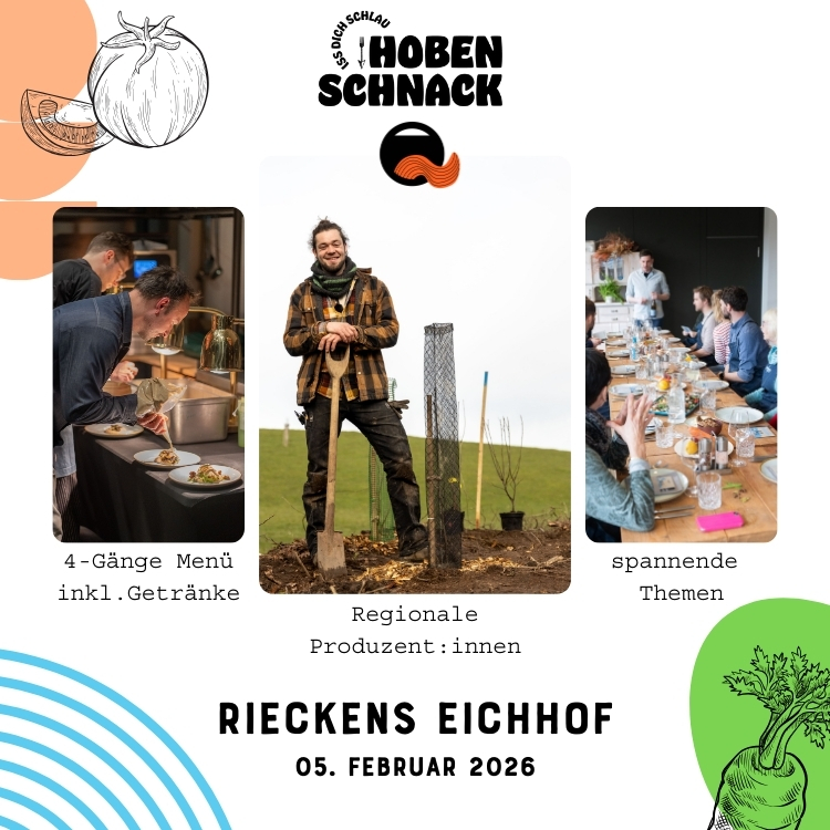 Kükentöten ist vielen ein Begriff – aber schon mal was vom Thema Bruderkalb gehört? Ihr könnt euch wahrscheinlich 1 und 1 zusammenreimen. Aber zum Glück gibt es Initiativen und Höfe, bei denen es anders läuft. So auch bei Felix Rieken. Er zeigt, dass Landwirtschaft heute nachhaltig, tiergerecht und voller Genuss sein kann. Auf dem Eichhof leben die Kühe von Frühjahr bis Herbst auf der Weide, die Kälber wachsen muttergebunden auf und ein Agroforstsystem sorgt für Artenvielfalt und gesunde Böden. In der hofeigenen Meierei wird die frische Bio-Landmilch zu cremiger Trinkmilch, feinem Joghurt und aromatischem Käse verarbeitet – direkt vermarktet über Hofladen und Lieferservice. Für ihr Engagement wurden sie 2021 mit dem 1. Platz des Nachhaltigkeitspreises Schleswig-Holstein ausgezeichnet. Wie er Tierwohl, Regionalität und Genuss so überzeugend verbinden, erklärt uns Felix beim Dinnerevent.